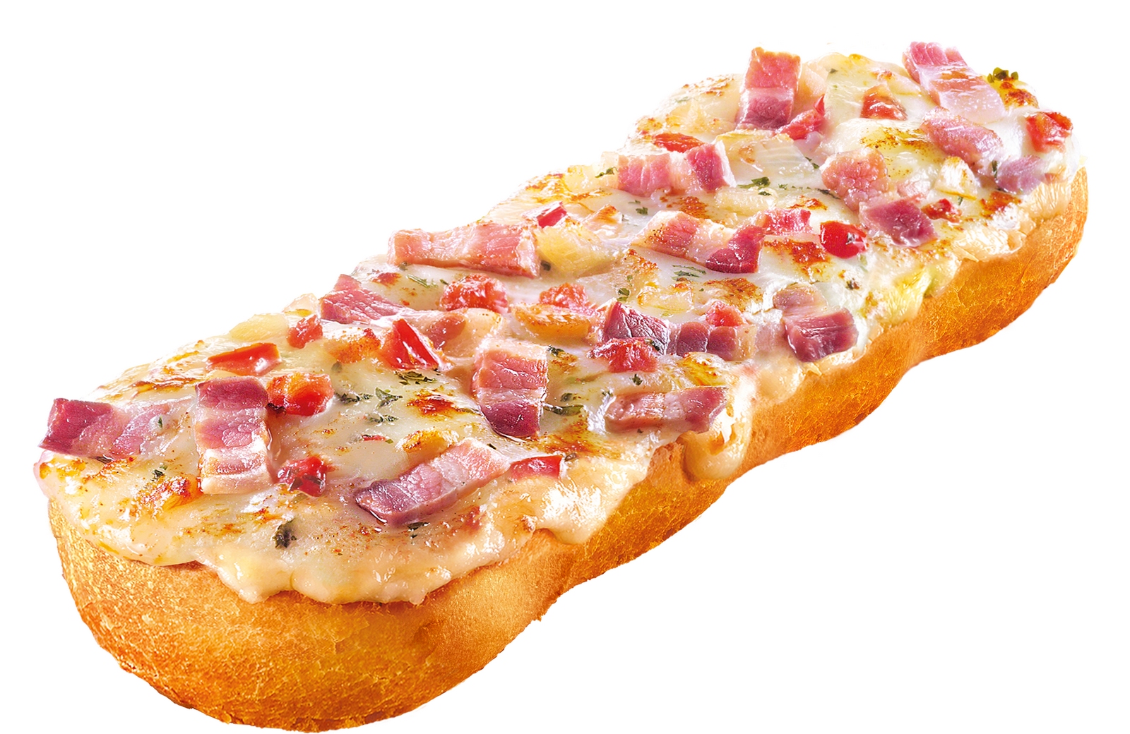 Baguette de bacon, queso Edam, tomate y cebolla frita.