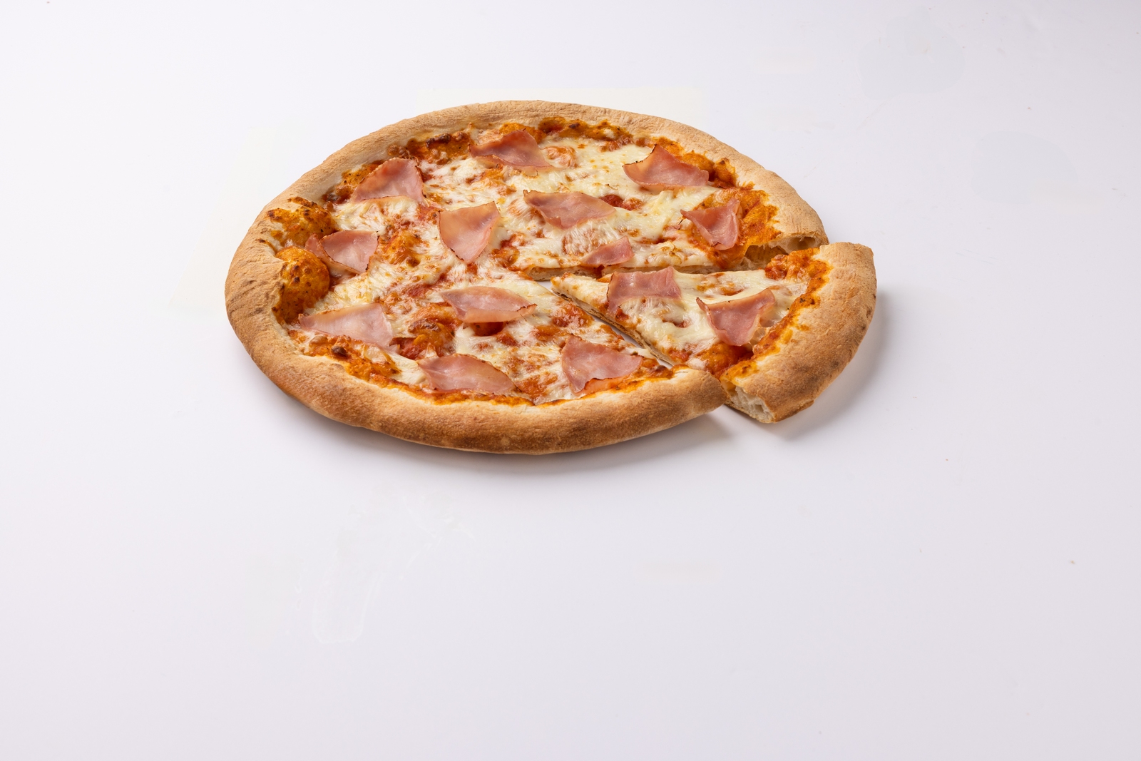 Pizza semiprecocida al horno de piedra con salsa de tomate especial, cremosa mozzarella y delicioso jamón cocido.