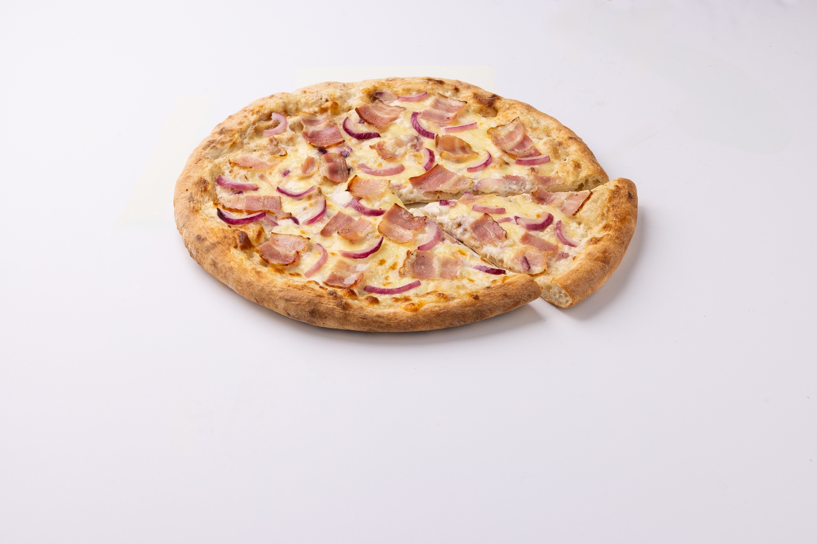 Pizza semiprecocida al horno de piedra con salsa Crème Fraiche (nata ácida), cremosa mozzarella, bacon y cebolla morada.