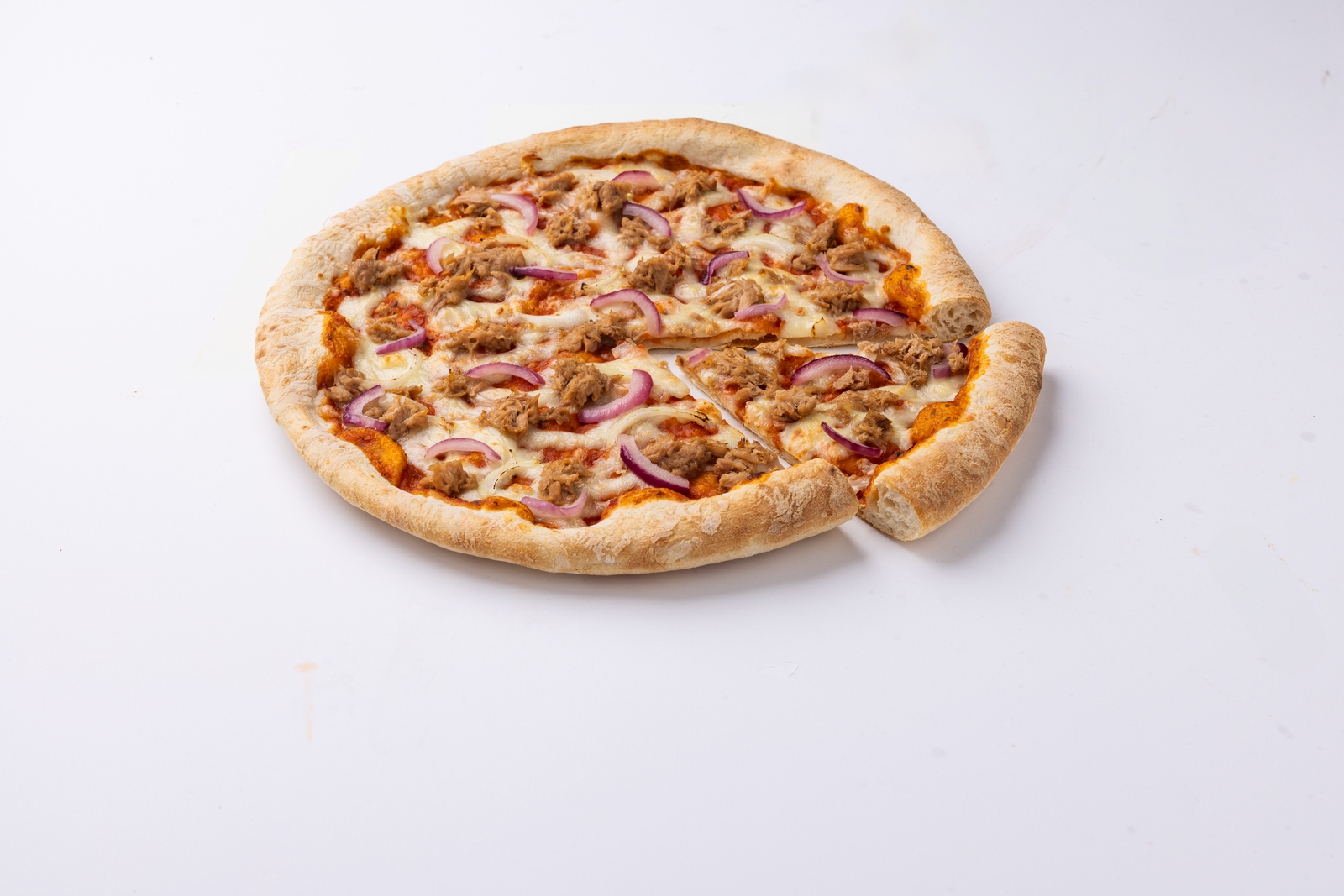 Pizza semiprecocida al horno de piedra con salsa de tomate especial, cremosa mozzarella, atún y cebolla.